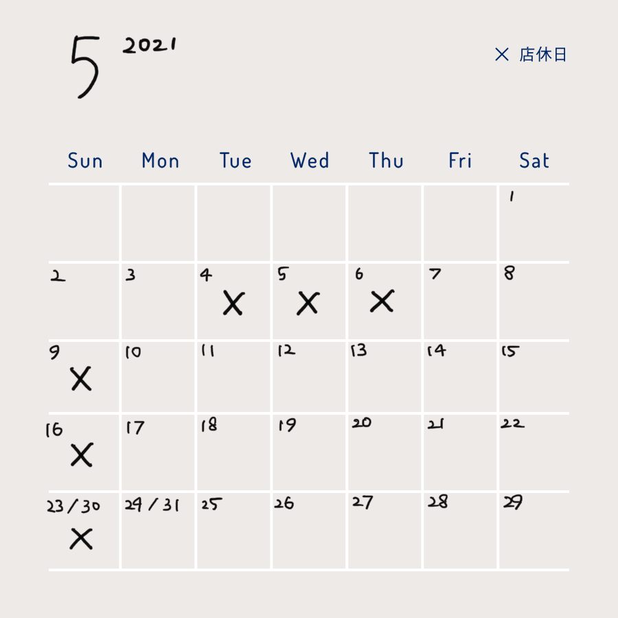 5月の営業日です。時短要請に応じて、5/1(土)〜5/12(水)は17:00〜21:00までの営業となります。
